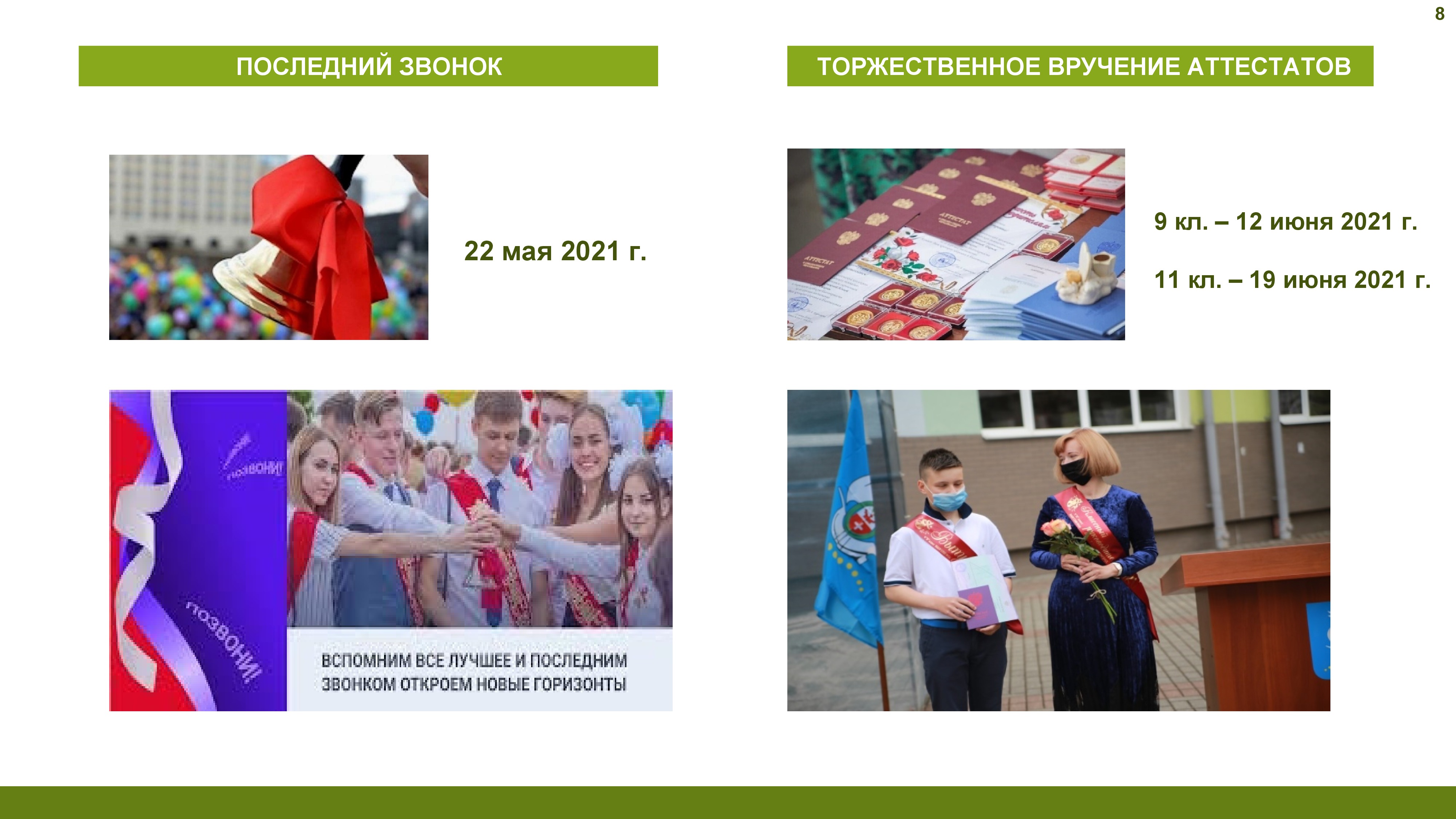 В завершение учебного года ребят ждут традиционные торжественные мероприятия: Последний звонок – 22 мая, вручение аттестатов об основном общем образовании выпускникам 9 классов – 12 июня, о среднем общем образовании выпускникам 11 классов – 19 июня».