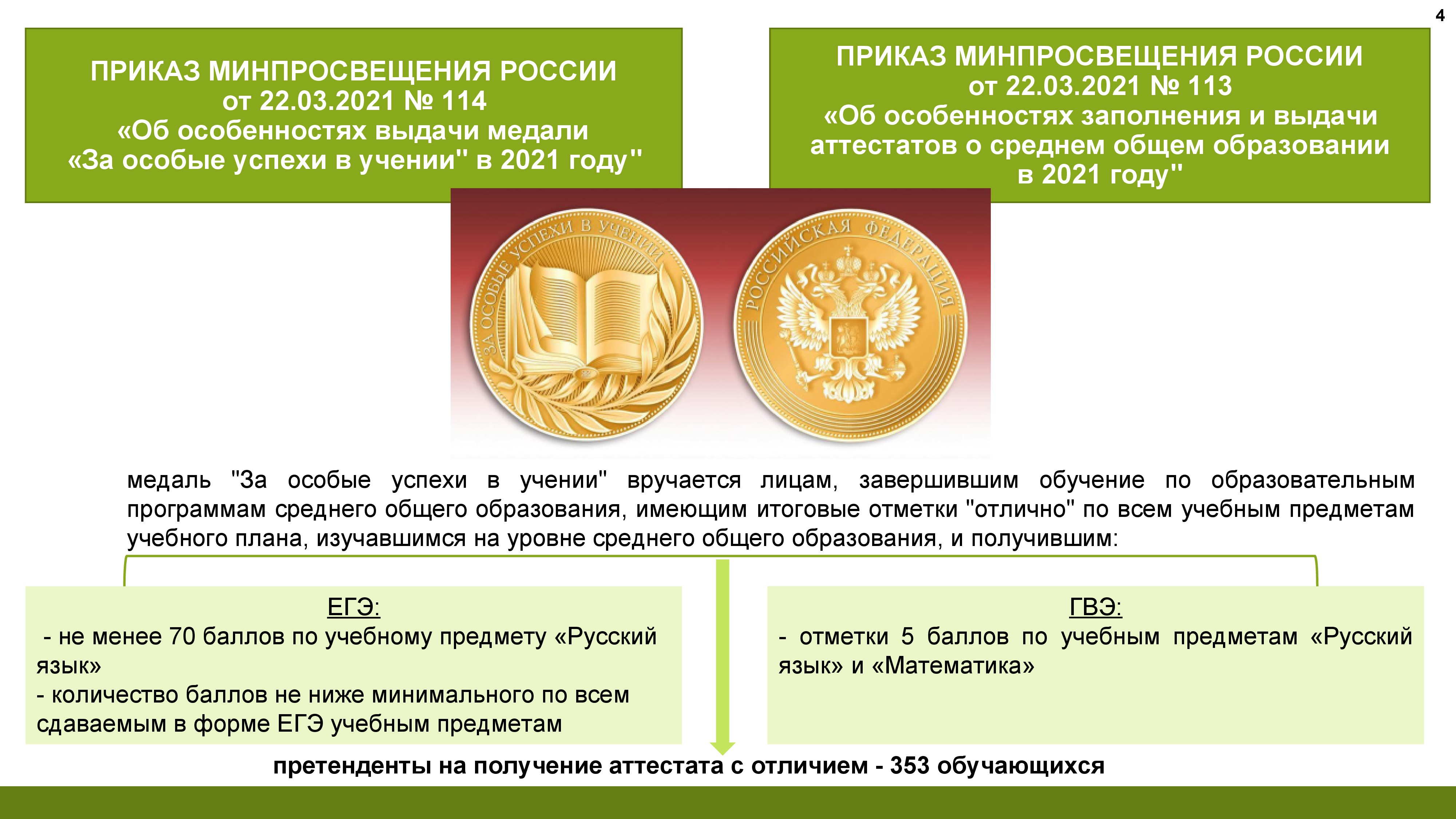В этом году право на получение аттестата с отличием и медали «За особые успехи в учении» получат выпускники 11-х классов, имеющие итоговые отметки «отлично» по всем предметам учебного плана за 10-й и 11-й классы и получившие на ЕГЭ по русскому языку не менее 70 баллов. Претендентами на получение аттестата с отличием являются 353 обучающихся 11-х классов.