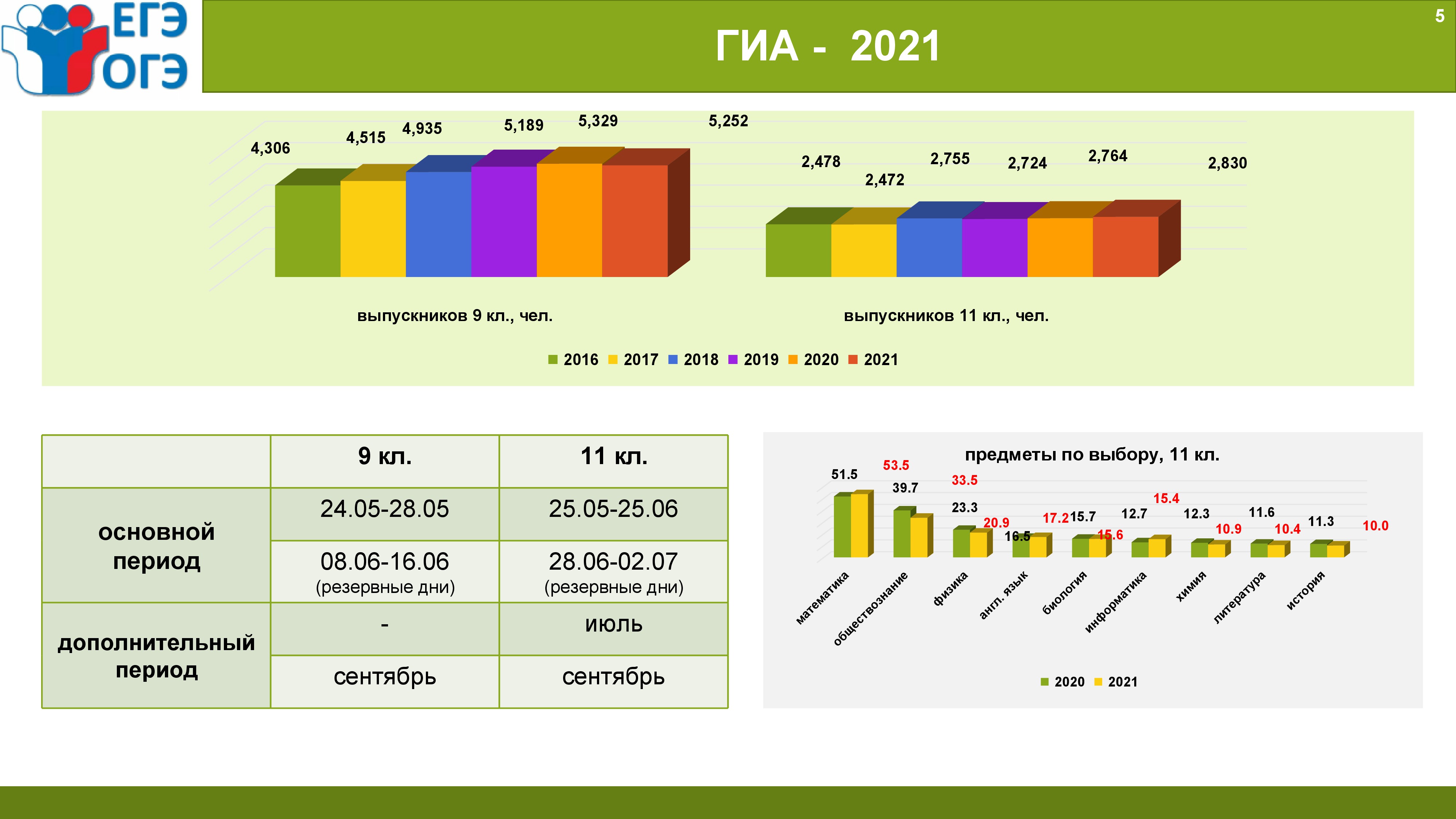 В 2021 году в ГИА примут участие 2 830 выпускников 11-х классов (в прошлом году – 2 764) и 5 252 выпускника 9-х классов (в прошлом году – 5331). Всего выпускников 9-х и 11-х классов – 8 082 человека.