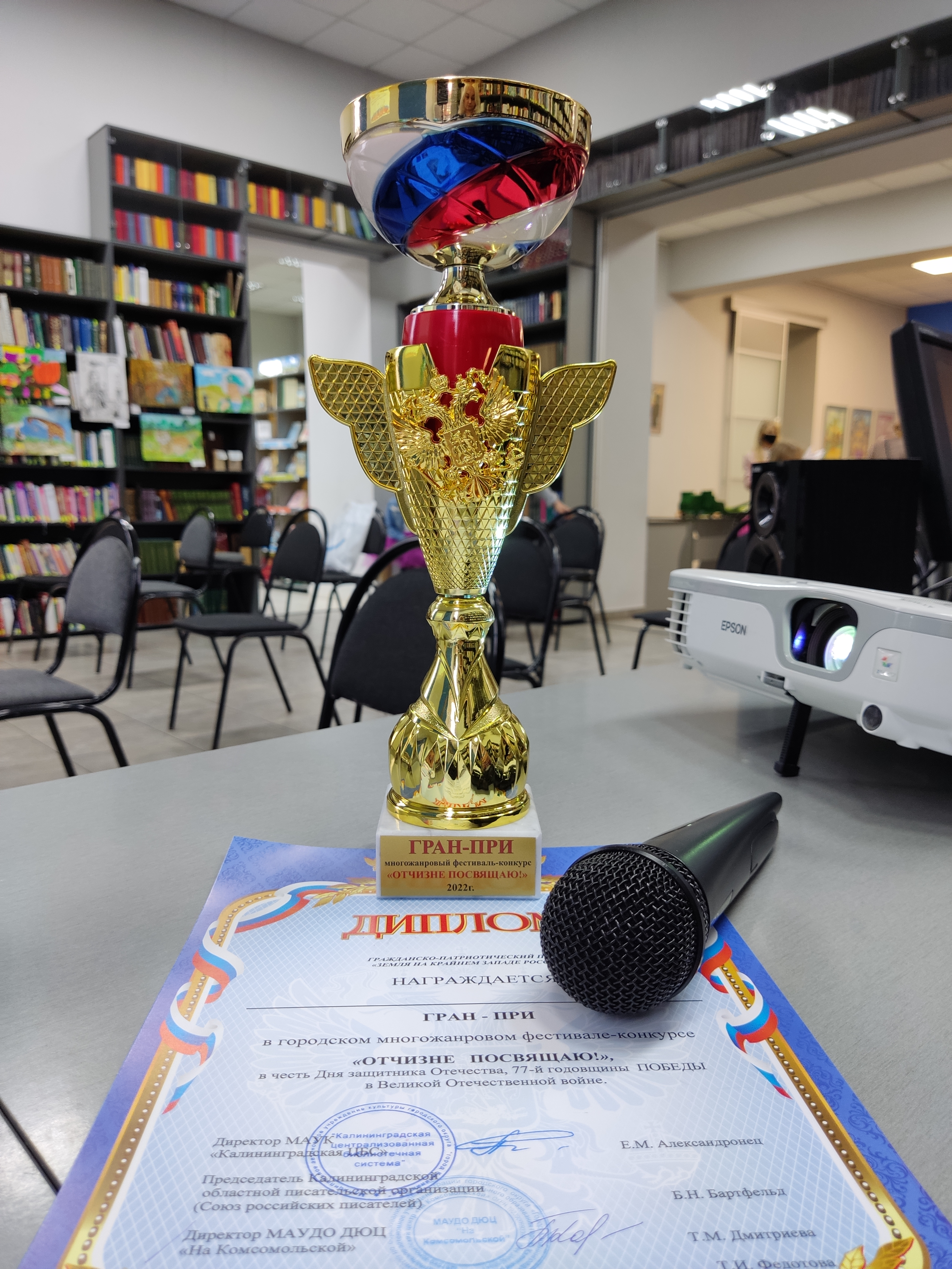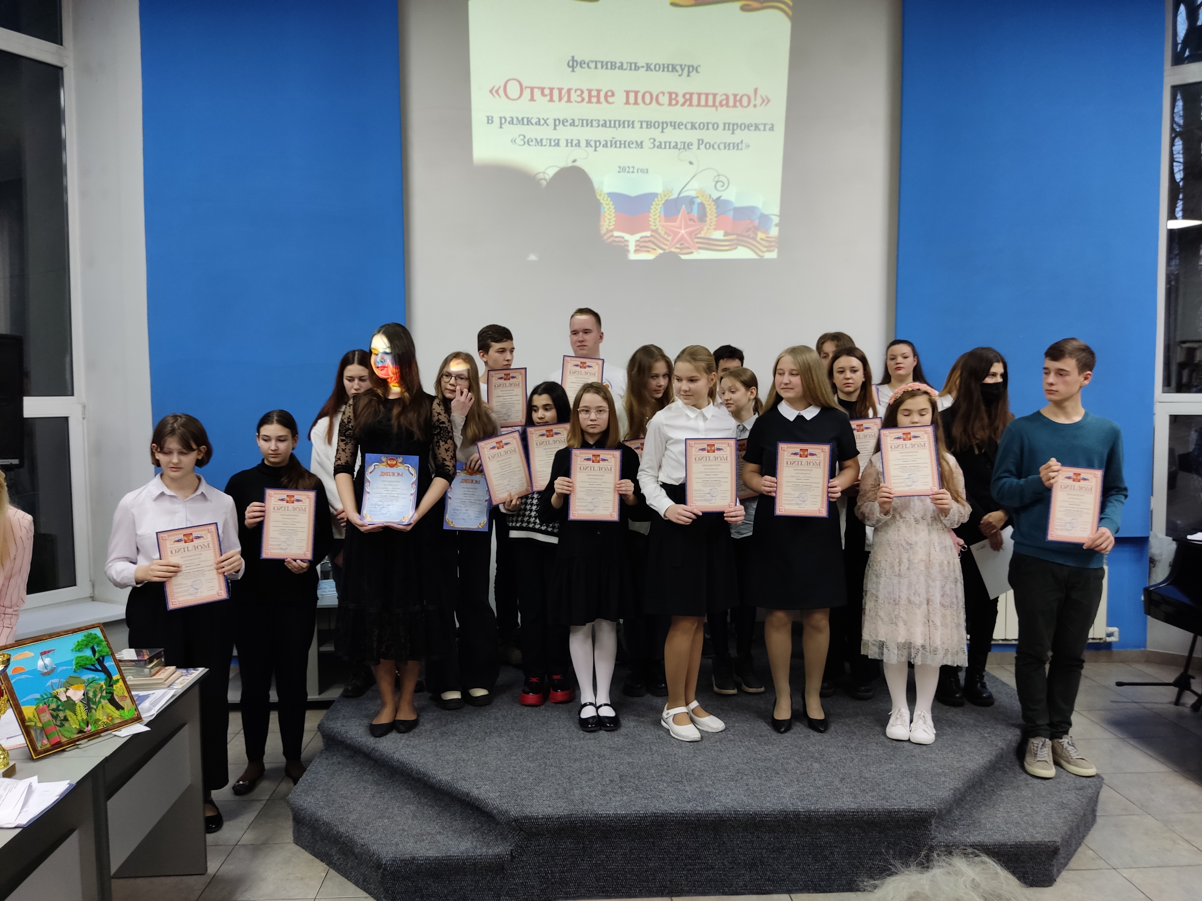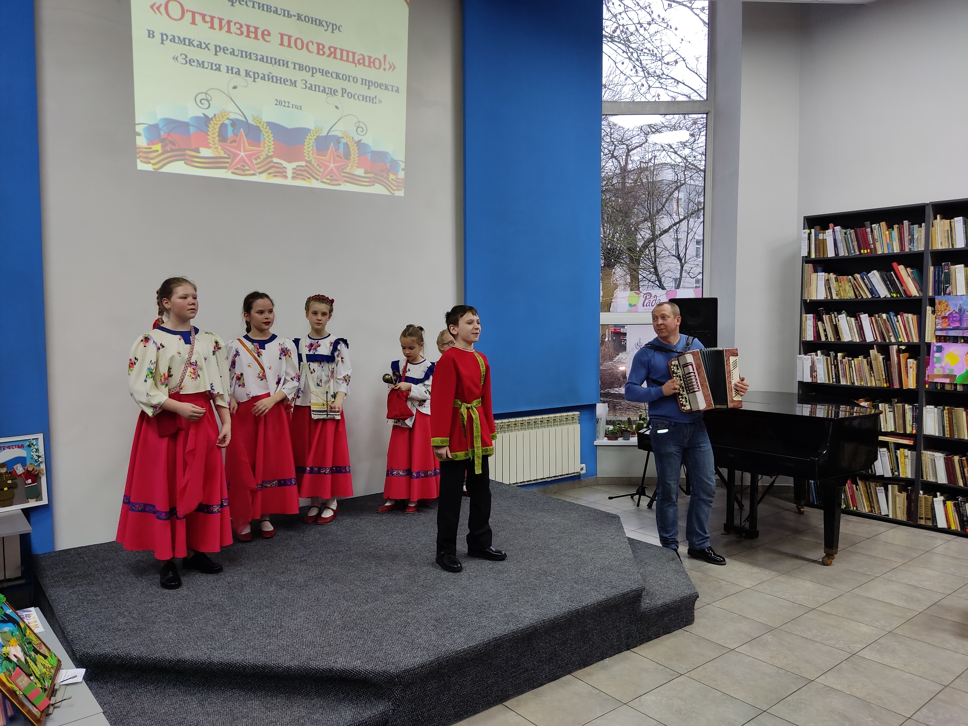 18 февраля 2022 г. в честь значимого для нашей страны праздника – Дня Защитника Отечества – состоялся открытый многожанровый фестиваль-конкурс «Отчизне посвящаю!» в рамках реализации сетевого творческого проекта «Земля на крайнем Западе России!». Организаторами фестиваля-конкурса выступили библиотека имени космонавта А.А. Леонова (МАУК «Калининградская ЦБС») и МАУДО ДЮЦ «На Комсомольской». В фестивале-конкурсе приняли участие обучающиеся творческих коллективов учреждений дополнительного образования и муниципальных общеобразовательных учреждений, являющихся партнёрами по сетевому сотрудничеству. Возраст участников конкурса – от 7 до 17 лет.