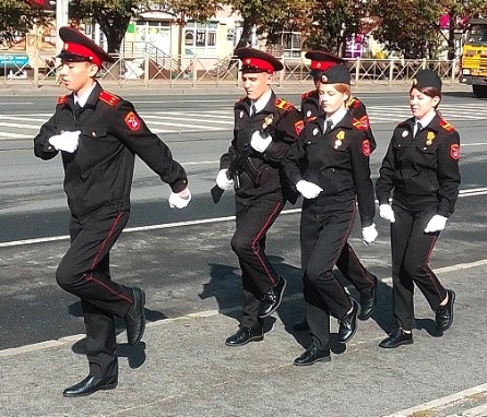Кадеты провели торжественную церемонию — прошли торжественным маршем, преклонили колено и час несли караульную службу возле памятника русскому полководцу Александру Суворову.