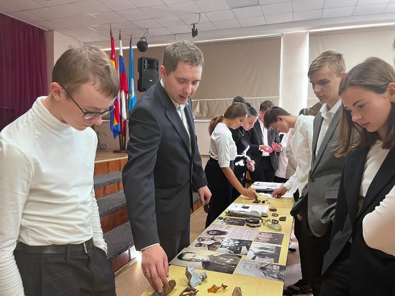 Руководитель поисковой группы «Рубеж» Максим Скалин приехал на встречу со своими находками: медалями и наградами, фрагментами найденных самолетов, архивными документами, а главное — с интересным рассказом о своих поисковых экспедициях, о коллегах и единомышленниках. А с каким огромным интересом ребята слушали Максима Вячеславовича, когда он рассказывал о поисковом отряде и его деятельности! Оказалось, что самая важная часть в раскопках — это найти деталь с номером самолета. Тогда можно узнать, кто на нем был и в какой день пропал, и для этого поднимаются старые архивы.