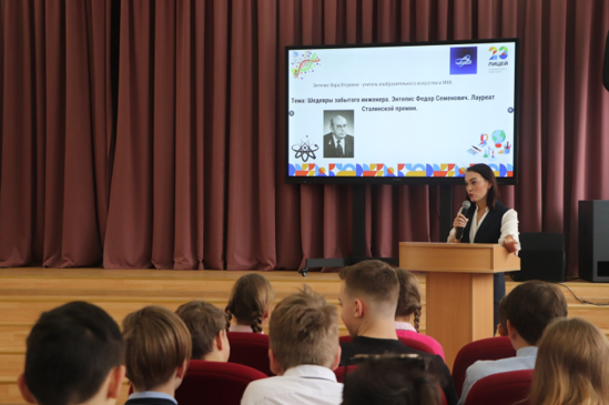 А в лицее № 23 состоялась творческая встреча с Верой Игоревной Энтелис, учителем изобразительного искусства и МХК лицея. Вера Игоревна рассказала о своём прадеде Фёдоре Семёновиче Энтелисе – советском технологе стекла, профессоре и изобретателе, лауреате Сталинской премии, на счету у которого - 18 авторских свидетельств. Созданный Фёдором Семёновичем хрустальный фонтан демонстрировался на Всемирной выставке в Нью-Йорке. Ф.С. Энтелис разработал технологию для создания противотанковых зажигательных сосудов. После войны Фёдор Семёнович разработал систему крепления стеклянных пластин на колоннах станции Ленинградского метрополитена Автово. Также Вера Игоревна провела викторину, посвящённую российским учёным, и лицеисты посмотрели видеоролик об изобретении телефона. Также лицеисты встретились с цифровым омбудсменом по Калининградской области, координатором федерального проекта «Цифровая Россия» в регионе Антоном Бураком. Ребята узнали, как максимально обезопасить себя в Интернете, обсудили со спикером трудную тему родительского контроля, поговорили о цифровых профессиях будущего. На встрече присутствовали Дмитрий Юрьевич Кулагин, директор регионального Центра информатизации образования.