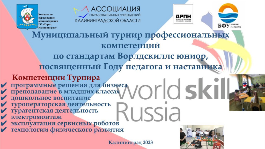 В течение двух недель базе калининградских школ №№ 22, 25, 32, 56 и детского сада № 55 участники Турнира демонстрировали профессиональное мастерство по 8 компетенциям: «Дошкольное воспитание», «Преподавание в младших классах», «Туроператорская деятельность», «Турагентская деятельность», «Программные решения для бизнеса», «Электромонтаж», «Эксплуатация сервисных роботов», «Технологии физического развития».