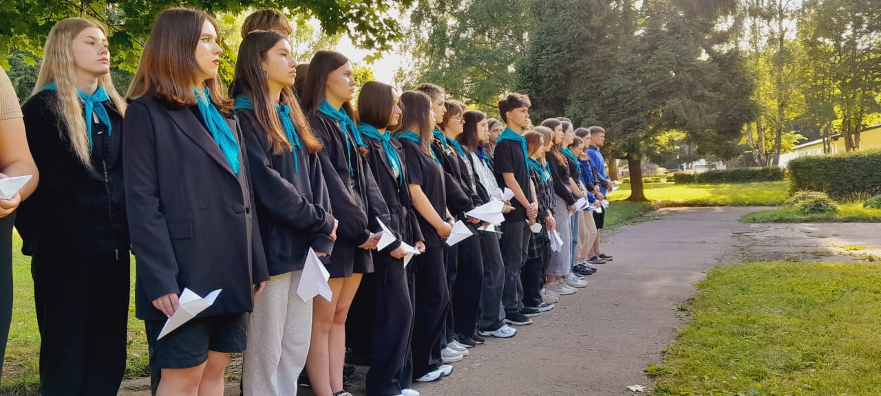 Присутствующие почтили память детей, погибших в Донецкой Народной Республике во время вооруженного конфликта. Учащиеся, кадеты почтили их память белыми бумажными корабликами и возложили цветы.