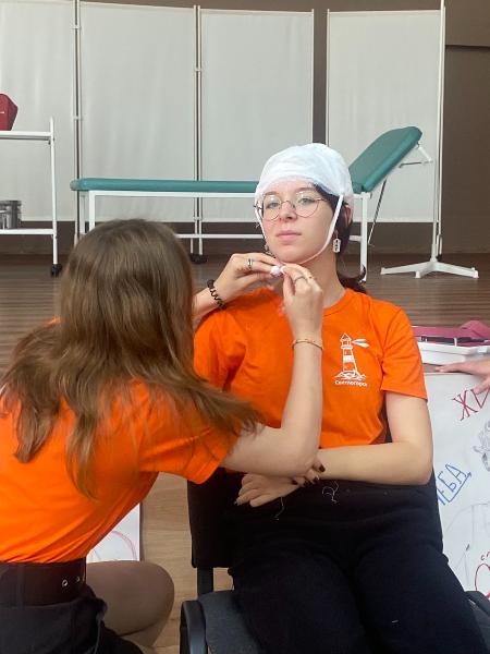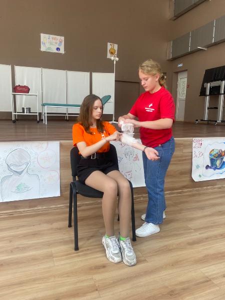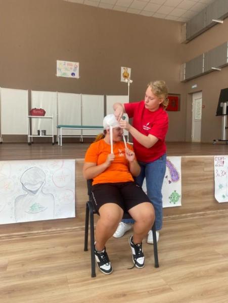 Специалисты рассказали ребятам о высокой активности клещей в конце лета, где они обитают, как одеваться, находясь в лесу. Волонтер-медик рассказала и провела практические занятия по первой медицинской помощи с ребятами старшего отряда. В ходе обучения воспитанники научились накладывать жгут на открытую рану и повязку «чепец» на голову.