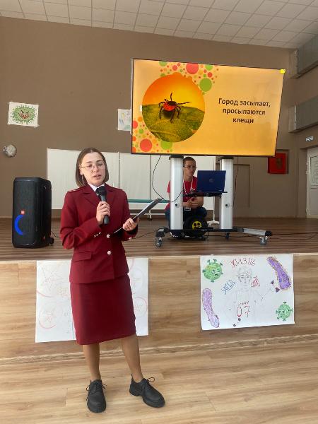 Перед ребятами выступили Еникеева А.И., ведущий специалист, эксперт Управления Роспотребнадзора по Калининградской области, Гончарова Л.С., врач энтомолог ФБУЗ «Центр гигиены по Калининградской области», и инструктор волонтеров-медиков Кузнецова Е.М., студент БФУ им. Канта, факультета медицины (сестринское дело) Горшкова Т.С., пресс- секретарь, эксперт Управления Роспотребнадзора по Калининградской области Коеникеева А.И.