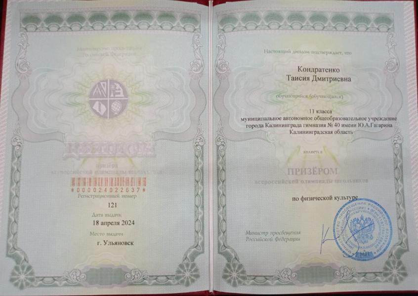 Заключительный этап Всероссийской олимпиады школьников по физической культуре, в котором приняли участие 287 школьников из 76 регионов страны, проходил на базе Ульяновского государственного университета с 13 по 18 апреля. Калининградскую область представляла одиннадцатиклассница гимназии № 40 им. Ю.А. Гагарина Кондатенко Таисия, которая показала высокий уровень подготовки и стала призером олимпиады.
