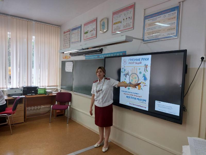 В ходе открытого урока школьники искали ответы на загадки по теме «Здоровый образ жизни», рисовали «микробы» и «бактерии», затем посмотрели подготовленный Управлением Роспотребнадзора по Калининградской области видеоролик «Моем ручки». Под руководством Елены Анатольевны полученную теорию закрепили на практике - научились правильно мыть руки.