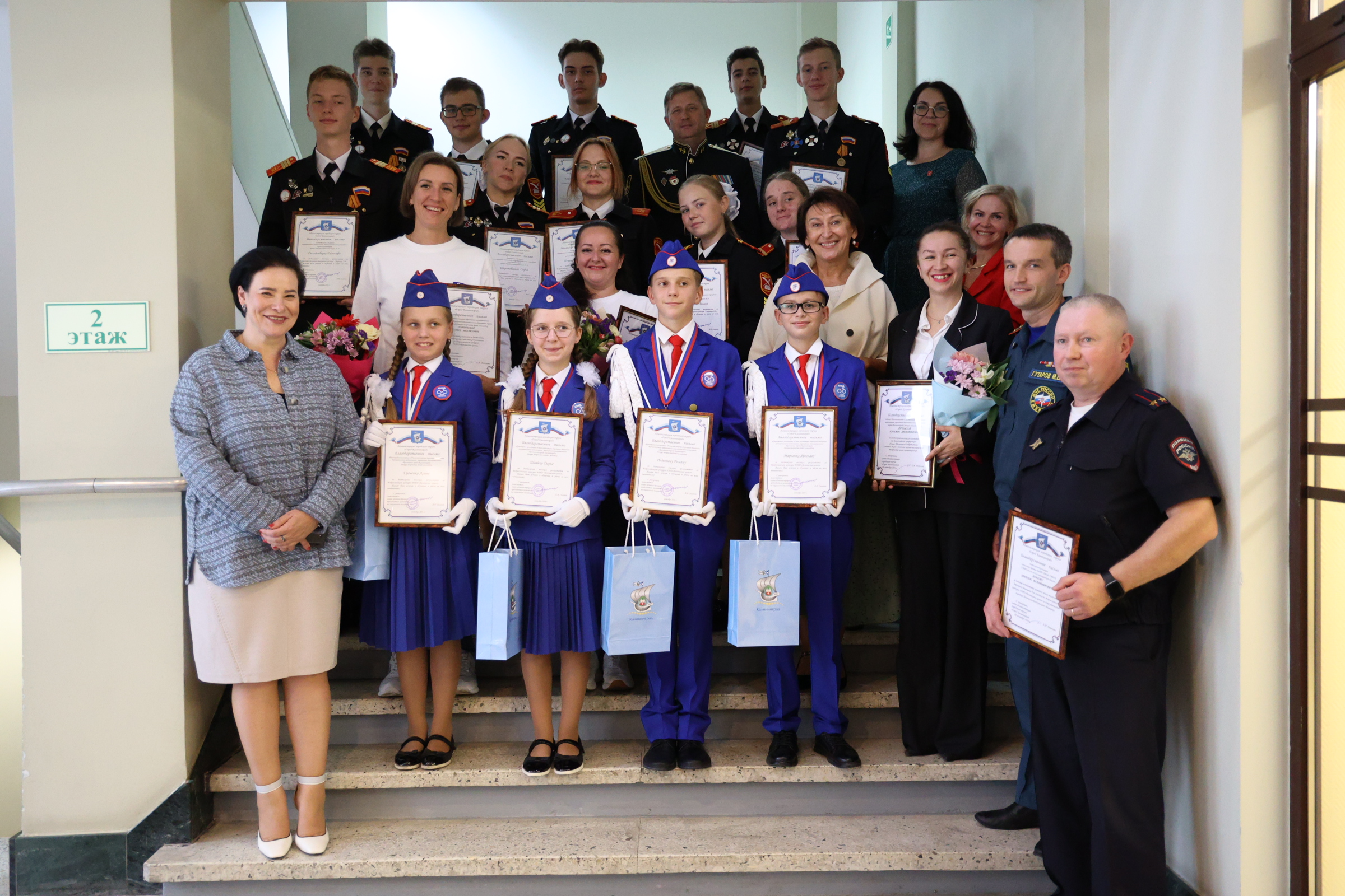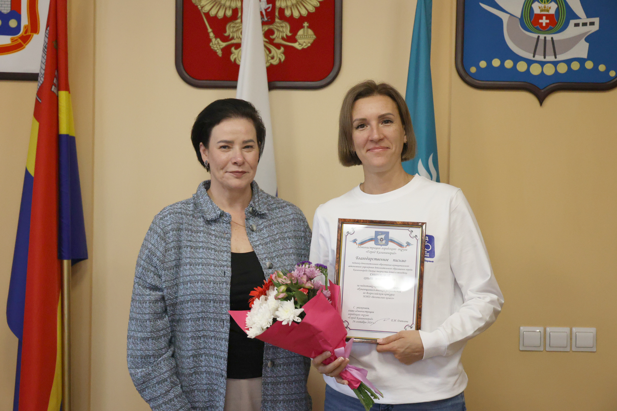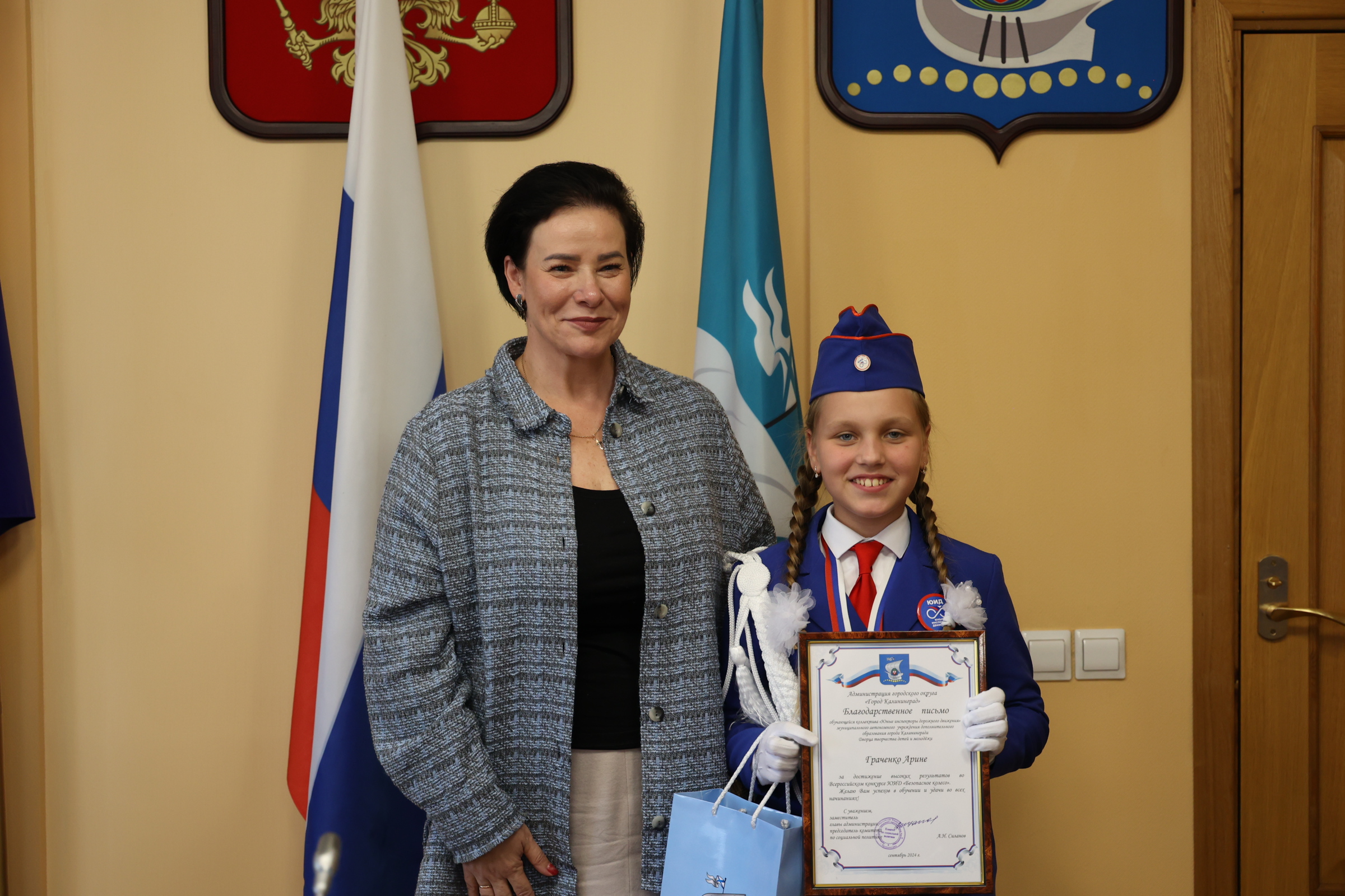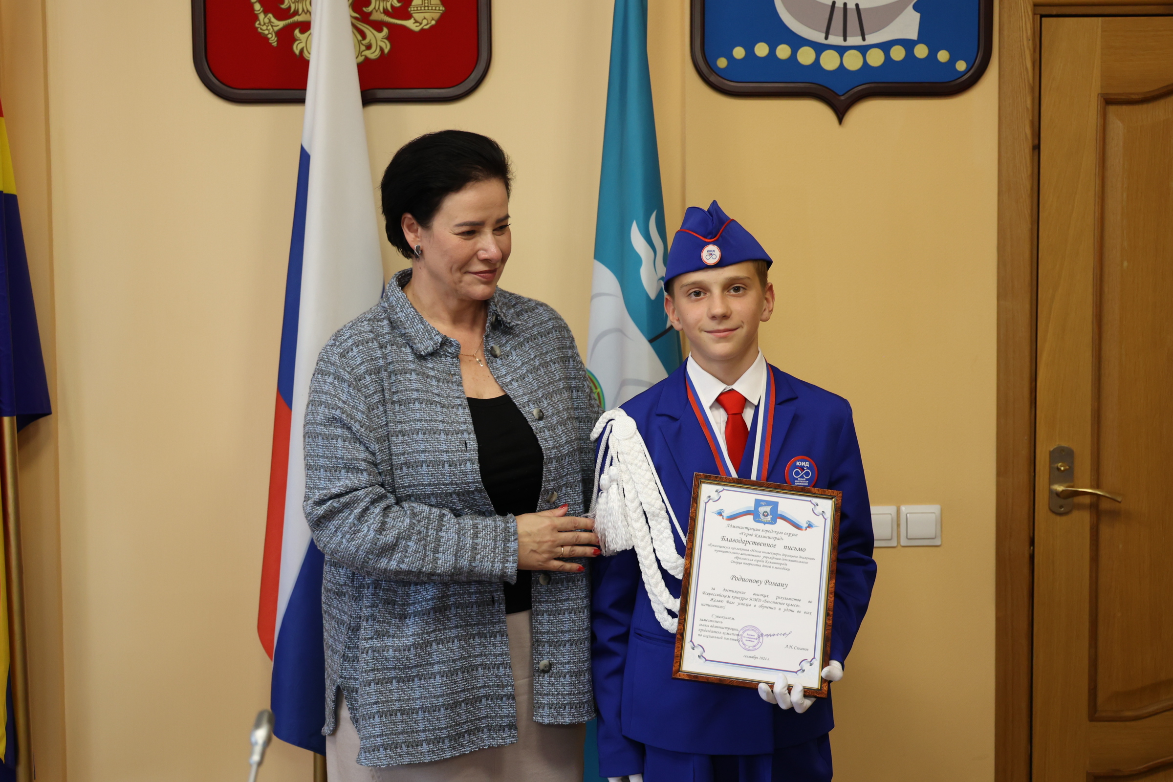 Благодарственные письма и поздравления также получили юные инспекторы дорожного движения. С 1 по 7 сентября в Екатеринбурге состоялся Всероссийский финал конкурса юных инспекторов дорожного движения «Безопасное колесо». Всего в нем принимали участие 86 команд – это представители субъектов Российской Федерации, ставшие победителями региональных этапов. В борьбе за звание лучшей команды участвовали школьники в возрасте от 10 до 12 лет – на протяжении недели они соревновались в знании правил дорожного движения и основ оказания первой помощи, умении ориентироваться в дорожно-транспортной среде, фигурном вождении велосипеда, СИМ. Калининградскую область представляли учащиеся Дворца творчества детей и молодёжи: Швайко Дарья, Граченко Арина, Родионов Роман, Марченко Ярослав под руководством педагога-наставника Ольги Гаврюковой и педагога дополнительного образования Фролович Валентины. В личном зачёте наши ребята попали в десятку лучших юидовцев страны: 5 место из 172 мальчиков занял Роман, 10 место - Ярослав, 4 место из 172 девочек заняла Дарья, 9 место – Арина. По результатам всех конкурсных испытаний наша команда вошла в тройку, заняв третье место на пьедестале.