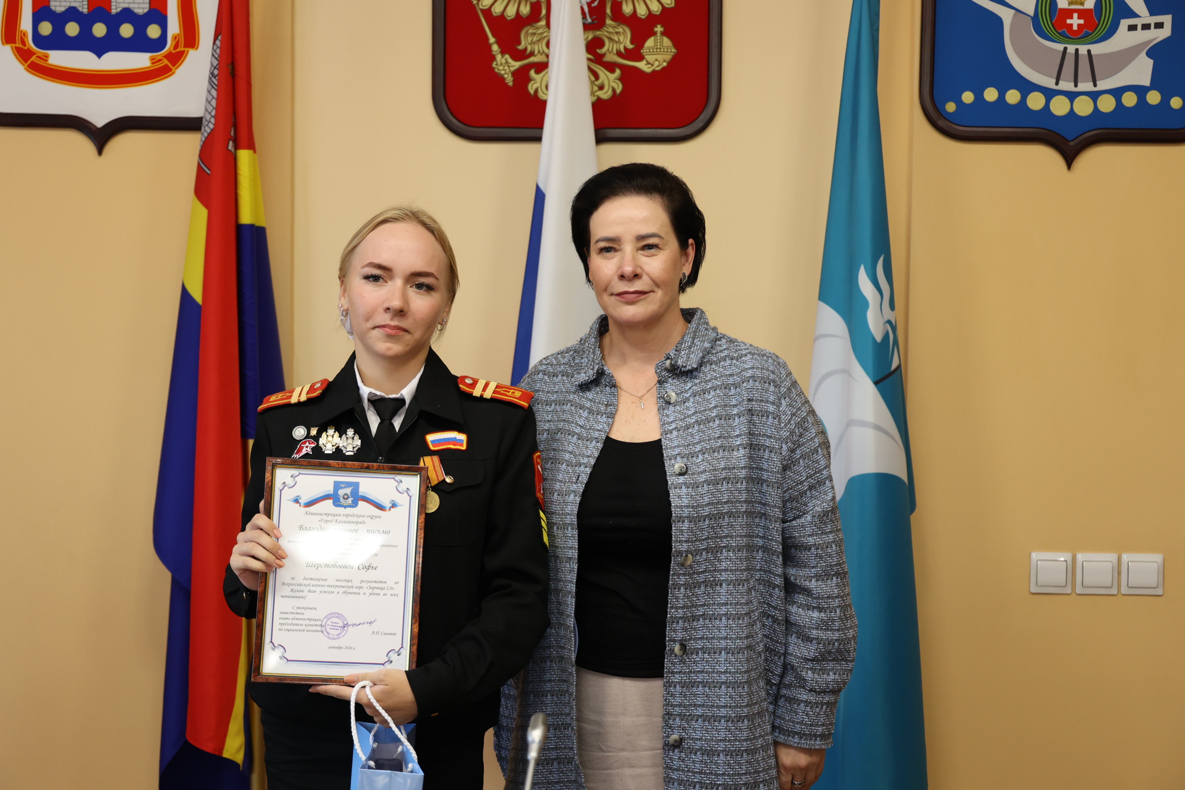 Сегодня в администрации Калининграда чествовали участников Всероссийской военно-патриотической игры «Зарница 2.0» и «Безопасное колесо 2024». Поздравила ребят и их наставников глава областного центра Елена Дятлова.