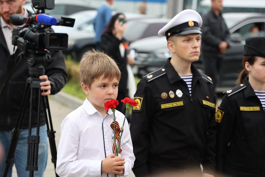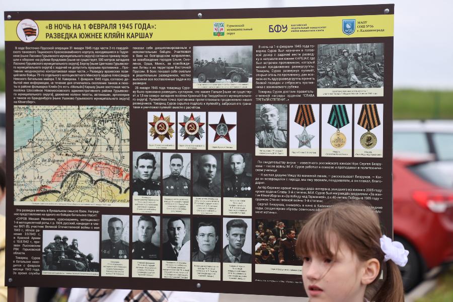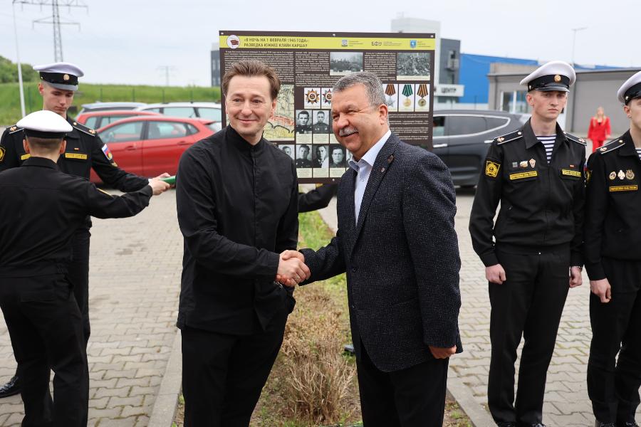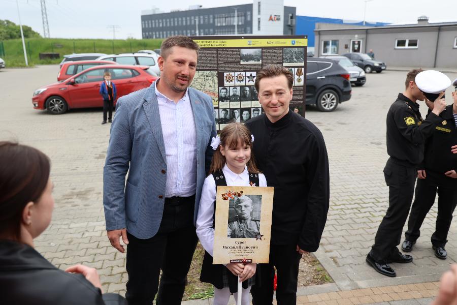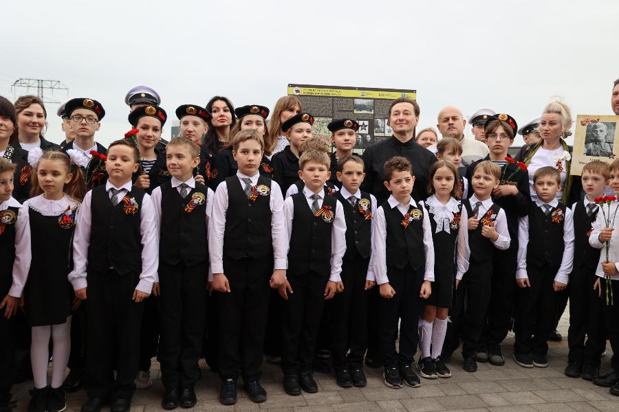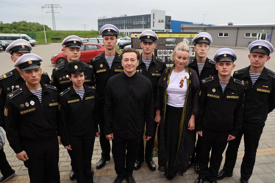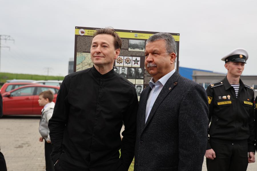 Вместе с актёром школьники возложили цветы к мемориальному стенду, установленному в 2024 году Центром военно-мемориальных исследований БФУ им. И. Канта в рамках проекта «Дороги русского солдата». Стенд увековечивает имена бойцов, участвовавших в боях в этом районе. Под руководством учителя начальных классов Ларисы Коржуевой ученики подготовили стихи и рассказ о подвигах бойцов 79-го отдельного мотоциклетного батальона, отличившихся в сражениях.
