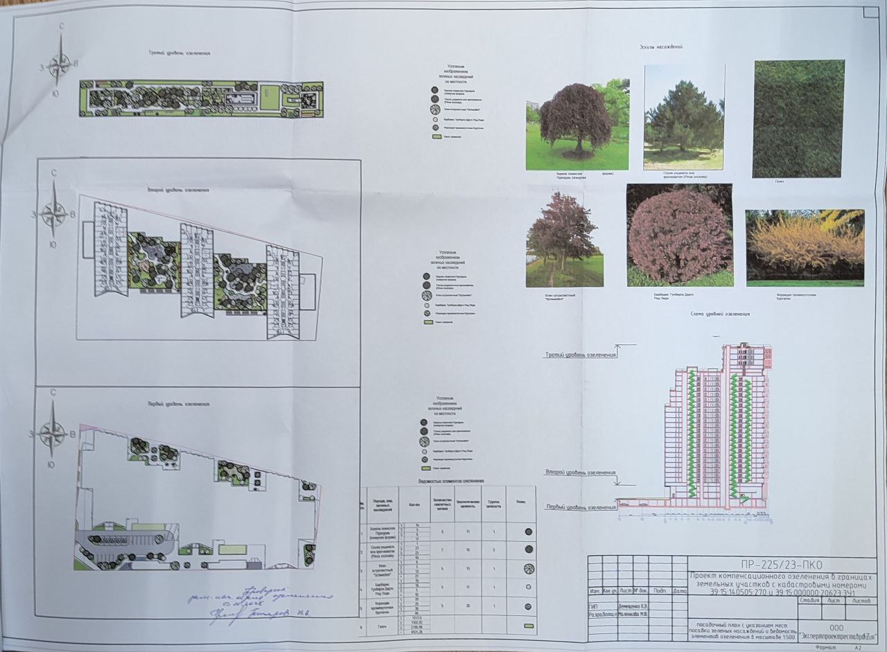 | ООО "СЗ " Минстрой". Проект компенсационного озеленения. Многоквартирный жилой дом со встроенными нежилыми помещениями и подземной автостоянкой по адресу: Калининградская обл., г. Калининград ул. О Кошевого - ул. Интернациональная (на земельном участке К | г. Калининград ул. О Кошевого - ул. Интернациональная (на земельном участке КН 39:15:142015:89 | посадка 108 деревьев |