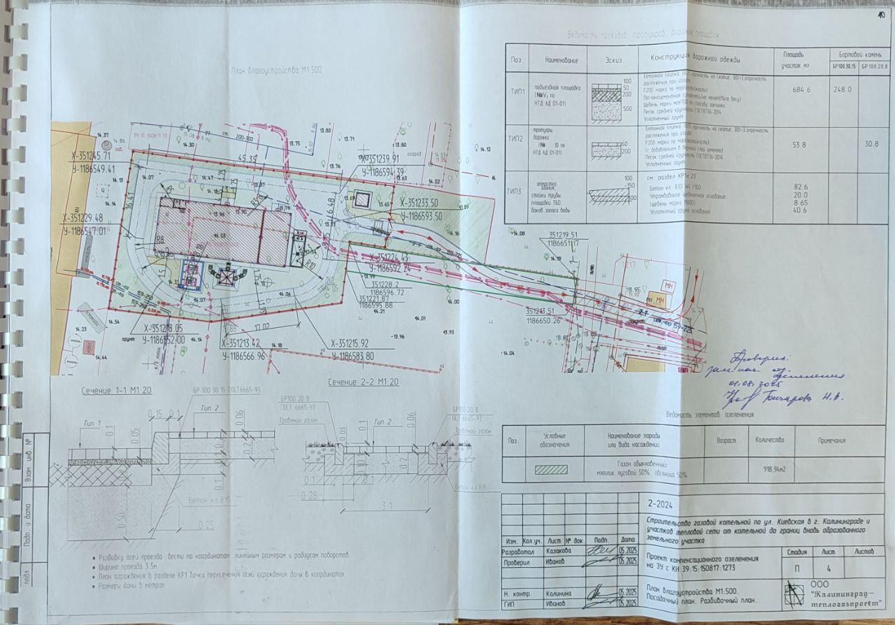 | МП «Калининградтеплосеть». Строительство газовой котельной по ул. Киевская в г. Калининграде и участков тепловой сети от котельной до границ вновь образованного земельного участка | ул. Киевская, 131-135 (КН 39:15:150817:967), ул. Киевская, 121В (39:15: 150817:1218), ул. Киевская (КН 39:15:150817:1273) | посадка 74 деревьев, 15 кустарников, обустройство 2363,6 кв.м. газона |