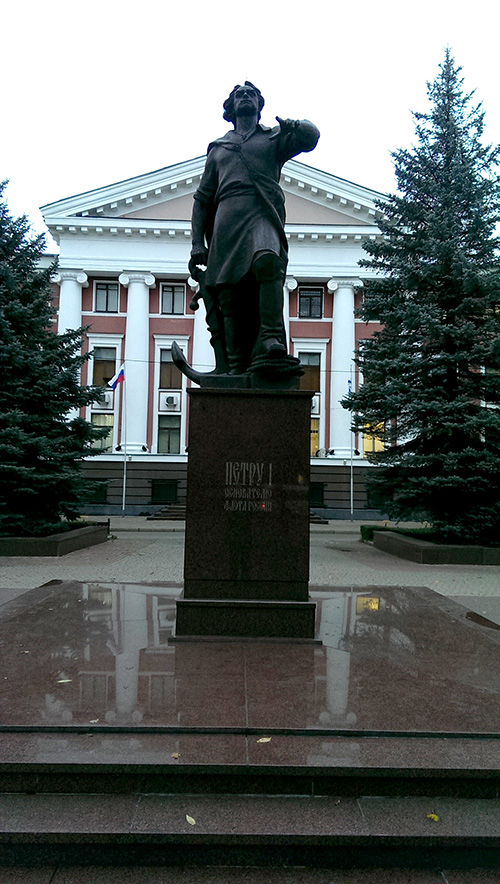 Трехметровая бронзовая скульптура царя Петра - копия скульптуры, установленной в Измайловском парке Москвы в 1998 году. Пьедестал установлен на трехступенчатом основании, надпись на пьедестале: "Петру I основателю флота России". Пьедестал памятника выполнен из красного полированного гранита.