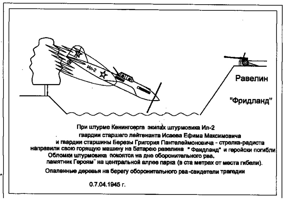 11 ноября 1988 года, во время очистки водоема около равелина "Фридланд", были обнаружены части штурмовика Ил-2, останки пилота и стрелка, личное оружие, парашюты, обгоревшие планшеты и фрагменты документов. Останки летчиков были перевезены на их родину и там захоронены.