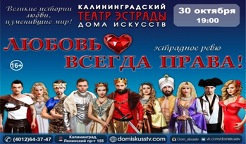 Калининградский Театр эстрады Дома искусств представляет большую концертную программу, состоящую из лучших музыкальных произведений, посвященных любви и, конечно же, женщинам.