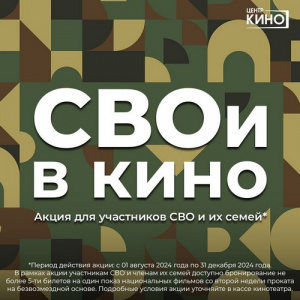 В кинотеатре #Космосфера стартует акция «СВОи в кино», которая продлится с 1 августа по 31 декабря 2024 года.