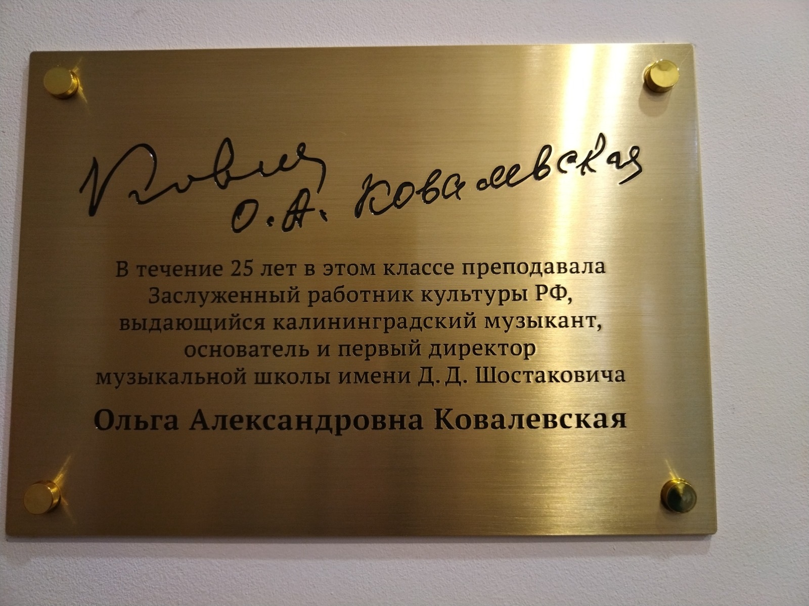 1 октября 2025 г. в Международный день музыки прошла церемония открытия памятного знака основателю, первому директору школы, Заслуженному работнику культуры РФ Ковалевской Ольге Александровне, руководившей МАУ ДО ГО «Город Калининград» «ДМШ им. Д.Д. Шостаковича» 25 лет.