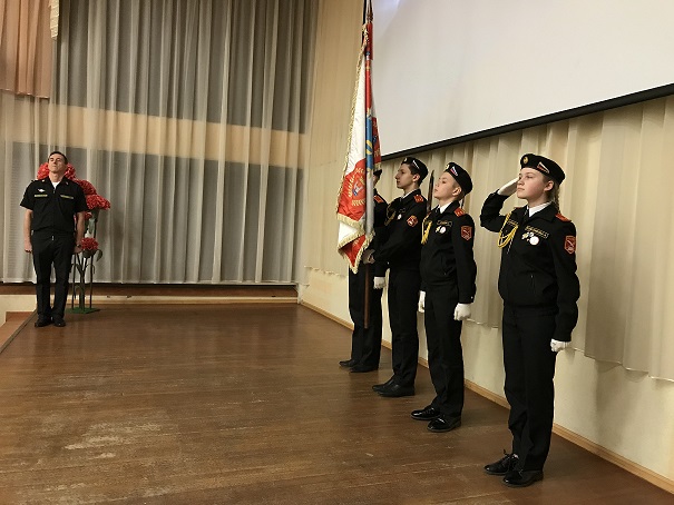 Торжественное мероприятие, посвященное 75-летию штурма города Гумбиннен, было проведено для учащихся 7-8-х классов. Торжественность мероприятию придал выход знаменной группы, состоящей из воспитанников кадетских классов.