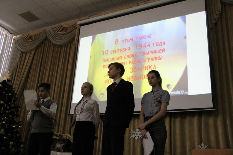 В день 75-летия взятия населенного пункта Аугстагиррен результаты исследования были представлены обучающимся, педагогам и родителям. Рассмотрены исторические факты, кинохроники наступления Советских войск в Восточной Пруссии, фронтовые трудности и примеры героизма советских воинов в ходе наступательной операции. Ребята рассказали о деятельности разведгруппы «Джек» в районе поселка и встрече с Геннадием Владимировичем Юшкевичем, непосредственным ее участником, живой легендой советской военной разведки.