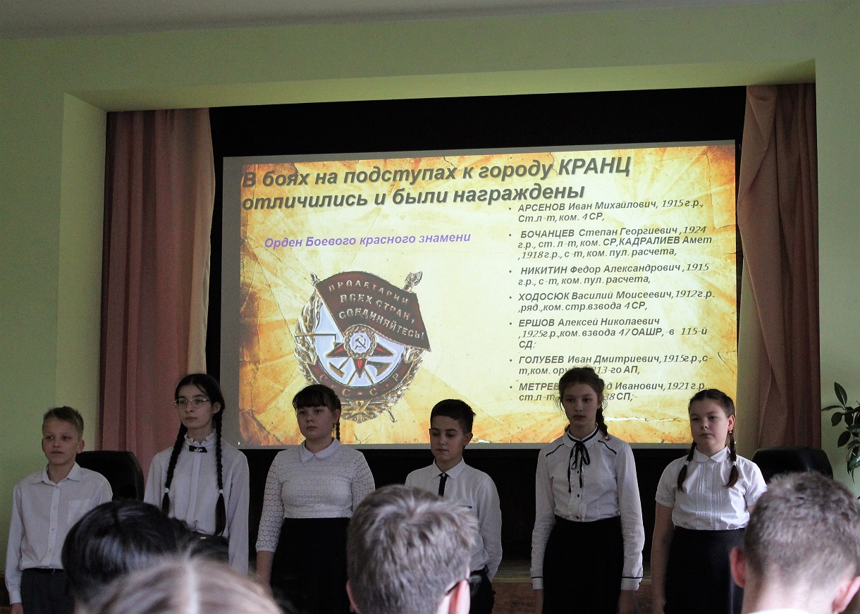 Участниками мероприятия были обучающиеся школы, родители и педагоги. Ученики 8-х классов представили проект «Взятие города Кранц», подготовили презентации о штурме города и материалы о посещении Зеленоградска, где состоялось возложение цветов к воинскому мемориалу. На мероприятии прозвучали песни и стихи, посвященные Великой Отечественной войне. Минутой молчания присутствующие почтили память погибших во время штурма Кранца.