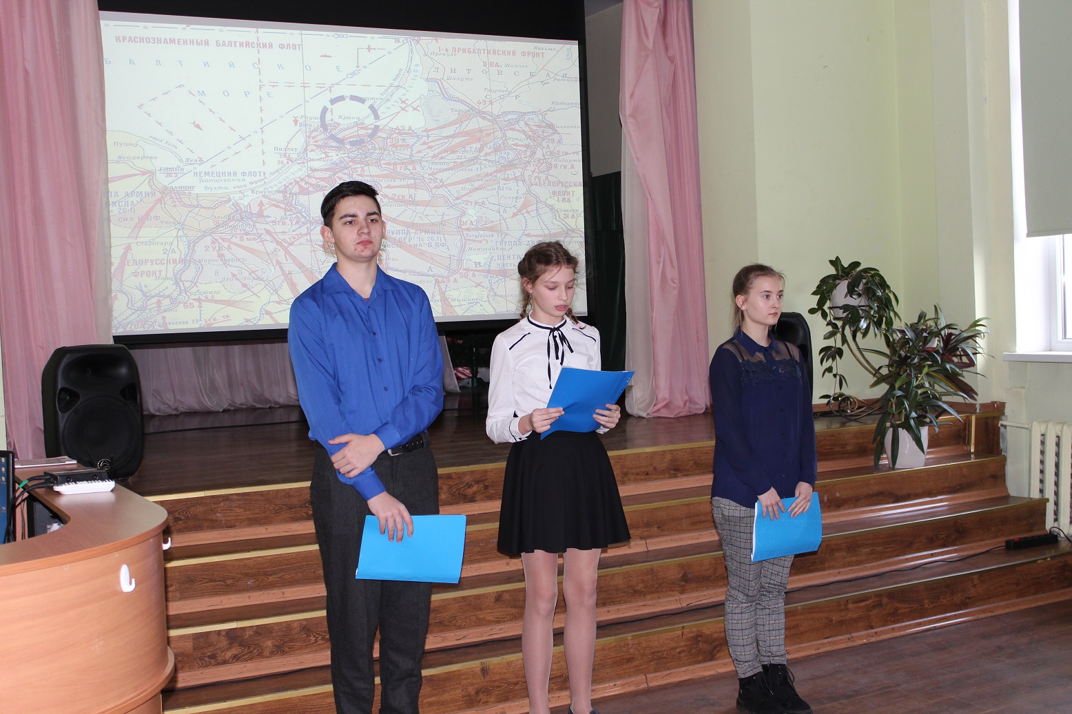В рамках проекта «Календарь Штурмов Красной Армией населённых пунктов Калининградской области зимой и весной 1945 года (Восточно-Прусская операция)» 4 февраля в школе № 5 прошло мероприятие, посвященное 75-летию Восточно-Прусской операции, штурму города Кранц (ныне – Зеленоградск), музыкально-литературная гостиная «Огненные версты войны».