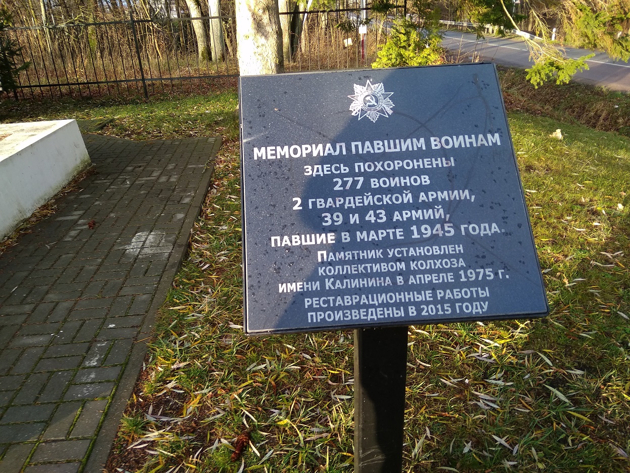 В центре поселка Рощино сооружен мемориал советским воинам, погибшим в марте 1945 года, где захоронено 227 воинов 2 гвардейской армии, 39 и 43 армий, в том числе Герой Советского Союза капитан Волосатов Иван Кириллович.