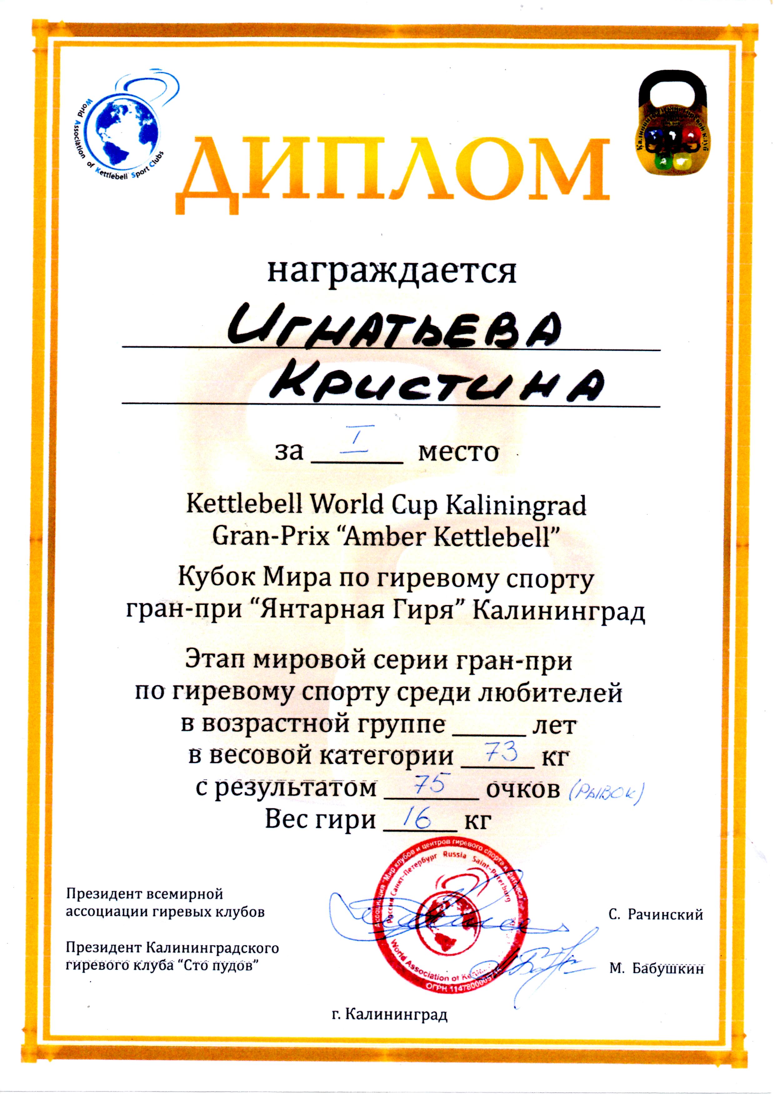 В минувшую пятницу, 14 сентября, ученица 10 «А» класса МАОУ СОШ № 13 Игнатьева Кристина стала победителем кубка Мира по гиревому спорту, обладателем Гран-при «Янтарная гиря» (Калининград). Спортивные соревнования прошли на базе МАУ СШОР по силовым видам спорта. На открытии кубка Мира присутствовали спортсмены из Польши, Эстонии, Ленинградской и Московской областей, а также представители Янтарного края. Открыть соревнования выпала честь Михаилу Бабушкину, Сергею Рачинскому и Дмитрию Лапикову, которые в свою очередь являются именитыми спортсменами, добившиеся вершины спортивных достижений и мастерства. Игнатьева Кристина отлично проявила себя в спортивных состязаниях и в результате стала победителем кубка Мира по гиревому спорту и обладателем Гран-при «Янтарная гиря». Этой победе предшествовали занятые первые места в первенствах Калининграда по гиревому спорту в классическом двоеборье среди юношей и девушек 2000 года рождения и моложе. Поздравляем Кристину с победой и желаем ей не останавливаться на достигнутом!