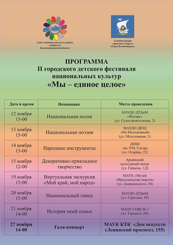 Яркие, незабываемые, интересные будни ждут калининградцев в рамках второго городского детского фестиваля национальных искусств «Мы – единое целое», который стартует 12 ноября 2018 года. Приглашаем посетить площадки фестиваля! Программа фестиваля [ http://eduklgd.ru/upload/news/programma.pdf ]
