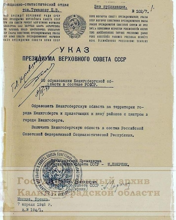 7 апреля 1946 года вышел Указ Президиума Верховного Совета СССР «Об образовании Кенигсбергской области в составе РСФСР». Другим Указом Президиума Верховного Совета СССР - от 4 июля 1946 года - область будет переименована в «Калининградскую». Тем не менее, именно первый документ определил ее статус как новой советской административно-территориальной единицы.