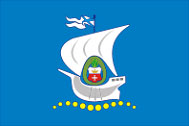 Прямоугольное полотнище насыщенного сине-голубого цвета с отношением ширины к длине 2:3. В центре полотнища - фигуры герба города Калининграда: плывущий к древку по волне, составленной из 12 шаров желтого цвета (диаметр которых увеличивается от краев к центру), одномачтовый корабль белого цвета с распущенным парусом и развевающимся флюгером, в крыже которого - диагональный крест синего цвета; ниже паруса на мачту наложен фигурный щит со старинным гербом Альтштадта (в верхней белой части красная корона, в нижней красной части - белый крест), окруженный овальным венком из ленты, состоящей из 4 зеленых и 3 черных полос, и увенчанный вверху трилистником зеленого цвета. Габаритная ширина корабля составляет 1/3 длины полотнища.