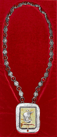 Гербовый щит располагается в центре массивной цепи (регулируемой длины с защелкой), состоящей из отдельных звеньев, шарнирно соединенных между собой. Звенья цепи - двух типов, чередующихся между собой: