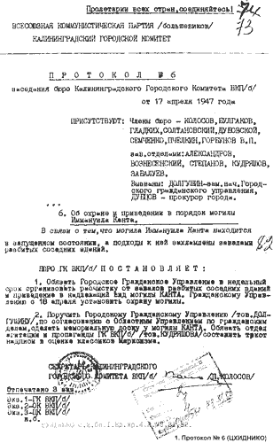 Публикуемый документ из фондов Центра хранения и изучения документов новейшей истории Калининградской области показывает, что одновременно с решением этих вопросов принимались меры по благоустройству и охране могилы И. Канта, установлению мемориальной доски с русским текстом.