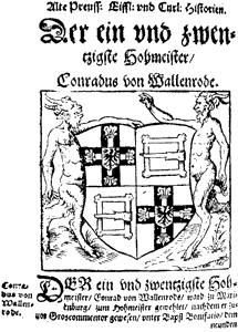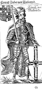 Конрад Валленрод происходит из древнего франконского рода, избран 12 марта 1391 года гроссмейстером Тевтонского ордена в тот момент, когда вследствие неудачи - осады Вильны - Орден очутился в очень стеснительном положении. Валленрод сначала продолжал крестовый поход против Литвы в союзе с князем Витовтом, когда же в 1393 году последний отпал от Ордена и соединился с польским королём Владиславом Вторым, Валленрод предпринял новую войну против обоих союзников, причинив много вреда Польше и Литве, но 25 июля 1393 года умер в припадке бешенства.