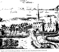 Город и орденская крепость Лабиау (гравюра из "Хроники "Хартноха") |