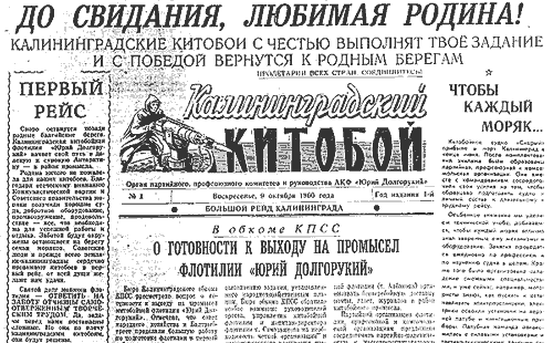 3. Титульная страница первого номера многотиражной газеты "Калининградский китобой" от 9 октября 1960 года. Калининградская антарктическая китобойная флотилия "Юрий Долгорукий" была создана в январе 1960 года и существовала по 1975 год. Флотилия совершила 15 рейсов. Экземпляры газеты "Калининградский китибой" сохранились в Государственном архиве Калининградской области (за 1962 и 1963 годы), в Калининградском историко-художественном музее (за 1965-1975 годы и отдельные экземпляры за другие годы).