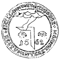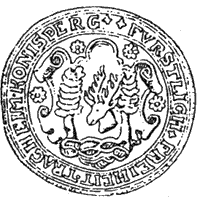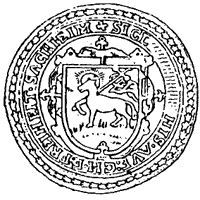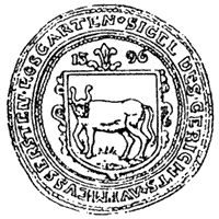 На первой известной печати, датируемой 1416 годом, изображён треугольной формы щит. В средней части помещена корона, обрамляемая сверху и снизу шестиконечными звёздами. По окружности латинским текстом, но готическим шрифтом: «SINOVE SIVSTAHS: LEVBENINICHT: KONIGERC.+».
