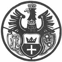 В последней четверти девятнадцатого столетия «коммунальный» герб практически прекратил своё существование, хотя в книге Армштедта и Фишера «Краеведение Кенигсберга», увидевшей свет в 1895 году на форзаце изображён именно он. «Коммунальный» герб сменил новый, объединивший гербы трёх городов под общей королевской короной: сверху справа располагался герб Альтштадта, слева - Лёбенихта, внизу - Кнайпхофа. Именно этот герб украшал башню кнайпхофской ратуши, в которой заседал Кёнигсбергский магистрат вплоть до 1927 года. Гербы были нанесены на щиты немецкого типа, а вот на гербе Альтштадта вкралась геральдическая ошибка: крест оказался мальтийским. Мальтийский крест можно обнаружить также на «коммунальном» гербе и на этикетке (назначение которой мне неизвестно), изданной магистратом города (по всей видимости конец 19 века). Этикетка повторяла собой городскую печать и была выполнена на тиснённой плотной бумаге в виде круга с зубчиками на внешней стороне, в центре было изображение трёх гербов под общей короной, а по окружности надпись «MAGISTRAT d KONIGL. HAUPT u RESIDENZSTADT KONIGSBERG». Следует отметить, что к этому же периоду относится и выпуск этикетки с символикой (печатью) кёнигсбергского купечества, на которой был изображён трёхмачтовый парусник с королевским прусским орлом на корме и надписью «VORSTEHER AMT D. KAUFMANNSFT zu KONIGSBERG».