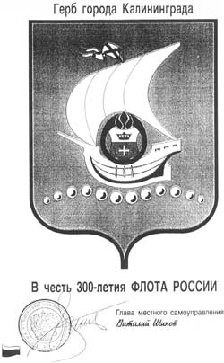 И, наконец, только с началом перестройки возник вопрос о создании герба Калининграда. Тогда же разрешили, хотя и со «скрипом» интересоваться и историей малой родины до 1945 года. Начали появляться в продаже вымпелы, календари, прочая печатная продукция и значки, на которых присутствовал и старый герб города. Основным инициатором выпуска этой продукции стал Григорий Лерман, краевед и председатель областного геральдического общества. Наиболее популярна была серия значков «Исторические гербы городов области» с гербом Кенигсберга образца 1906 года. Приложил руку к этому бизнесу и автор этих строк. По моему заказу на одном из московских заводов в 1994 году была заказана серия значков «Исторические гербы городов Земланда». Среди них был и герб Кенигсберга. К сожалению, в этом значке были допущены отступления, не по моей прихоти: на гербе Альтштадта корона и на гербе Кнайпхофа рукав - изображены золотыми. А в 1990 году, при содействии областного фонда культуры и его тогдашнего председателя Юрия Иванова, в типографии «Калининградская Правда» была выпущена серия открыток, посвященная старому Кенигсбергу. Открытки были подготовлены к выпуску западногерманским издательством Rautenberg. Открывала эту серию открытка с гербом Кенигсберга.