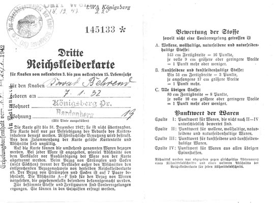 Моё детство прошло в Кенигсберге, и многое сохранилось в моей памяти ещё и потому, что это было время богатое событиями. Я родился в 1932 году в Кенигсберге и крещён в евангелическом соборе. Сначала я с родителями, с сестрой, десятью годами старше меня и с двумя младшими братьями жил на Кайзерштрассе, потом на Унтерхаберберг, а с лета 1939 года - на Харденбергштрассе в районе Хуфен. С весны 1938 по 1942 год я посещал Хуфенскую гимназию (теперь Государственный колледж градостроения), расположенную на Тиргартенштрассе (ныне ул. Зоологическая). Мой отец работал на так называемой Шприт-фабрике (Sprit - спирт-ректификат) на Викбольдерштрассе (ныне ул. Полтавская). Он трудился там в качестве экспедитора до 1945 года и получал ежемесячно к зарплате ещё (натуроплатой) 1 литр 90%-го спирта, который оказался позже во время войны очень полезным продуктом для обмена. На работу отец ездил летом на велосипеде, а зимой чаще всего на трамвае. Моя мама была домохозяйкой, она вела хозяйство и заботилась о нас, детях. Для меня - шестилетнего - была особенным событием так называемая «Хрустальная ночь» в ноябре 1938 года. Когда я утром 10 ноября шёл в школу, то увидел по дороге несколько разрушенных и сгоревших магазинов. Витрины их были выбиты, а входы забиты досками. В школе мы спросили нашего учителя, что произошло ночью. Он коротко ответил, что ничего об этом не знает. Лишь позже я узнал кое-что об этой акции нацистов против евреев. Наши родители никогда в присутствии нас, детей, не вели разговоры на политические темы. И они никоим способом не участвовали в сборищах нацистских организаций.
