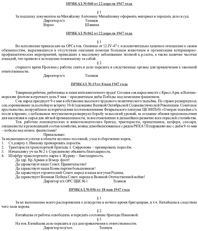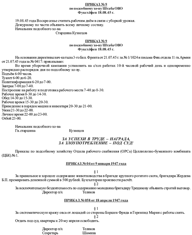 Ниже воспроизводится текст двух приказов по подсобному хозяйству «Штаба ОБО» (особого военного отряда?), расположенного в посёлке Фуксхёфене (пос. Славяновка).