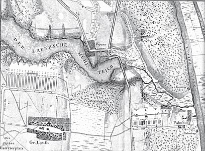 Уже вскоре после строительства замка Кенигсберг, Тевтонский орден заложил на этом месте хутор и мельницу [10, S. 168]. Для приведения её в действие, а это была водяная мельница, была запружена протекавшая здесь речка, впадающая в Новый Прегель (Новую Преголю). Образовавшийся извилистый пруд получил название по месту, где он находится, и по своему назначению: Лаутский мельничный пруд (Lauther Muehlen-Teich). А речка, соответственно, была названа Мельничным ручьём (Muehlen-Fliess). Просто и незатейливо.