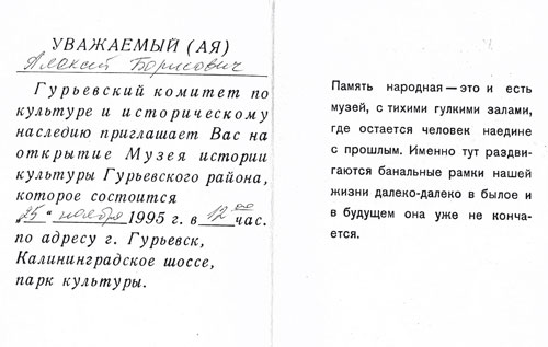 МУЗЕИ ИСТОРИИ И КУЛЬТУРЫ ГУРЬЕВСКОГО РАЙОНА Основан в 1995 году. Инициатор основания музея - председатель комитета по культуре и историческому наследию Валентина Ивановна Самойлова. Общая площадь экспозиции -135 квадратных метров. Она включает в себя шесть залов. Зал 1. «Старый город» - экспозиция посвящена довоенной истории Восточной Пруссии, города Нейхаузена (Нойхаузена) и замков, находящихся на территории Гурьевского района, демонстрируются предметы быта. Залы 2 и 3. «Первые переселенцы» -рассказ о людях, которым выпало осваивать наш край, возрождать его из руин и пепла. В зале № 3 представлен фрагмент комнаты первых переселенцев. Зал 4. «Русский народный костюм» - выставка рассказывает об истории создания народного костюма. Зал 5. «Боевая слава земляков» - экспозиция посвящена Великой Отечественной войне, штурму Кенигсберга, участникам войны в Афганистане и в Чечне. Зал 6. «Культура Гурьевского района» - рассказывает об учреждениях культуры и искусства Гурьевского района, традициях и обрядах, творческих коллективах, международных творческих связях. В фондах музея около 1 500 предметов, среди которых - сундук для пожертвований 1-го века, книга на старославянском языке «Княгиня» 16-го века, топор эпохи Тевтонского ордена, пушечное ядро, прялки, гладильный станок и другие. В музее хранится реферат «История замка Нойхаузен», написанный в 2005 году. Автор реферата Дарья Чурляева (преподователь курса краеведения А.Л. Лалэко). Первый директор музея - Любовь Александровна Азарова (музей первоначально размещался в отдельном домике в парке). С 2003 года директор музея - Лариса Александровна Самойлова. Контакты: Калининградская область, город Гурьевск, Калининградское шоссе, 6, рядом с детской школой искусств. Из: «Музеи Калининградской области». Калининград, 2005