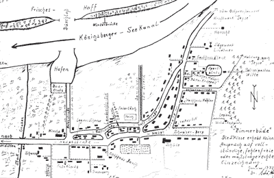 По живописной, сильно поросшей можжевельником лесной дороге, за полчаса можно дойти до следующей рыбацкой деревни. Циммербуде. На глубокой песчаной почве вытянулась она непосредственно вдоль берега. Несколько веков назад ландшафт залива выглядел здесь совсем по-другому: тогдашние два устья Прегеля находились гораздо дальше в заливе, чем теперь; они образовывали большие острова; один из них изображается длинною в треть мили и лежащим напротив Циммербуде.