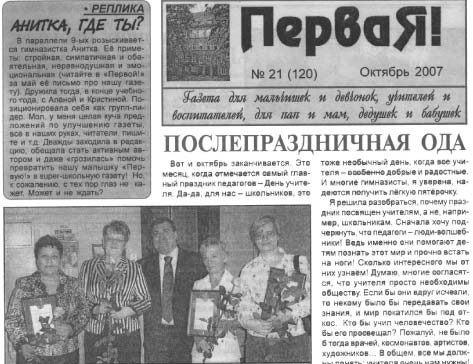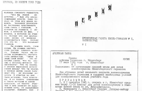 Писать историю калининградской гимназии № 1 не входит в мою задачу. Могу лишь подсказать, что материал для такого исследования можно собрать в школьном музее, созданном в 2002 году, а также почерпнуть в подшивке школьной газеты «Первая», издающейся с ноября 1993 года (первым редактором газеты «Первая» стала А.Зуева).