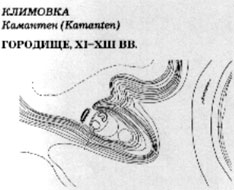 Городище XI-XIII веков. Площадка городища в плане имеет форму вытянутой трапеции, размерами 75х30 метров, высотой от уровня реки 12 метров. С напольной восточной стороны площадка укреплена внутренним, высотой 2 метра, и внешним, высотой 4 метра, валами. За внешним валом видны остатки заплывшего рва глубиной 0,5 метра. Восточный склон городища на расстоянии 30 метров от площадки городища полого спускается к реке, затем следует крутой склон, который, как и остальные склоны городища, эскарпирован (от "эскарп" - внутренняя отлогость наружного рва укрепления). При любительских раскопках, проведённых в середине 19-го века местными крестьянином, на внутреннем валу были обнаружены камни (очаг?), олений рог, каменный топор (точило?), небольшой сосуд. В шурфе культурный слой на площадке городища не обнаружен.