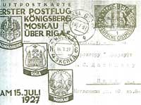 Нельзя обойти вниманием любопытную почтовую карточку совместной советско-германской авиакомпании "Дерулюфт", которая осуществляла пассажирские и почтовые перевозки Москва-Кенигсберг в 1922-1937 годах. На открытке в левом верхнем углу сделана надпись по-немецки "Воздушная почтовая карточка. Первый почтовый перелет Кёнигсберг-Москва через Ригу". Здесь же помещены Гербы Кенигсберга, Риги и Москвы. С правой стороны вверху отпечатаны две 20-пфенниговые марки немецкой воздушной почты, погашенные штемпелем Восточной Кёнигсбергской ярмарки. Открытка из Кенигсберга в Москву шла не более одних суток. Быстро и удобно!