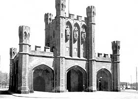 А мы как раз подходим к Королевским воротам, бросив беглый взгляд на здание бывшей пожарной вахты Восточной Пруссии, сейчас - помещение для общества слепых. Здание построено в 1907 году, имело номера 94-95, а теперь - № 105. Напротив -длиннющая девятиэтажка постройки 1973 года, прозванная в народе "Китайской стеной". Во дворе "Китайской стены" в немецкие времена стояла церковь Мира (Фриденскирхе), но от нее не отыскать и фундамента.