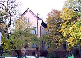 На углу стоит приметный дом. В нем обосновалась Маслобаза и организация с приятным названием "Свежесть". Здание построено в 1930-х годах и вмещало в себя общежитие нацистских штурмовых отрядов "Группа остланд" с собственной типографией.